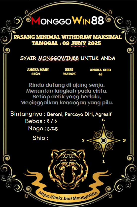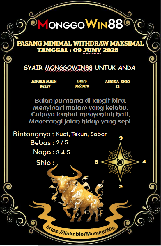 - Setiap angka menyimpan rahasia. Dan Monggowin88 adalah kunci untuk membukanya. Melalui syair-syair yang kami sajikan, kamu tak hanya membaca puisi — kamu sedang membaca kemungkinan, harapan, dan arah keberuntungan. Kami hadir setiap hari dengan syair togel yang tajam dan penuh makna, disusun oleh tim berpengalaman dan peka terhadap pola. Jika kamu percaya bahwa hoki bisa dituntun, maka biarkan Monggowin88 jadi penuntunmu.